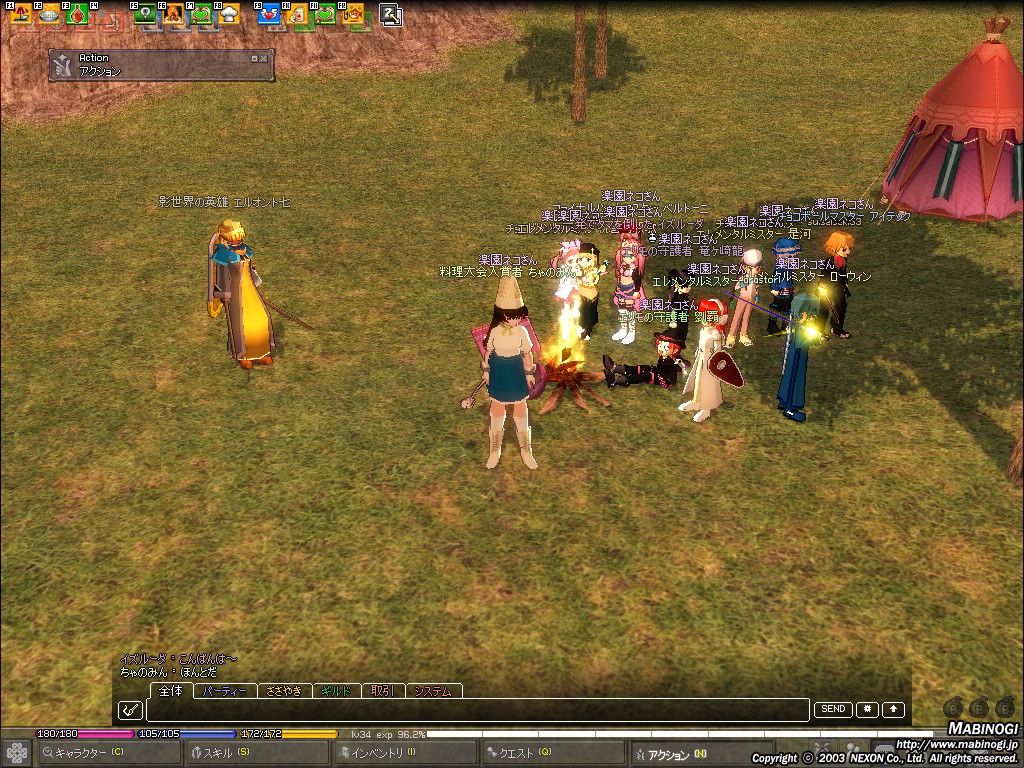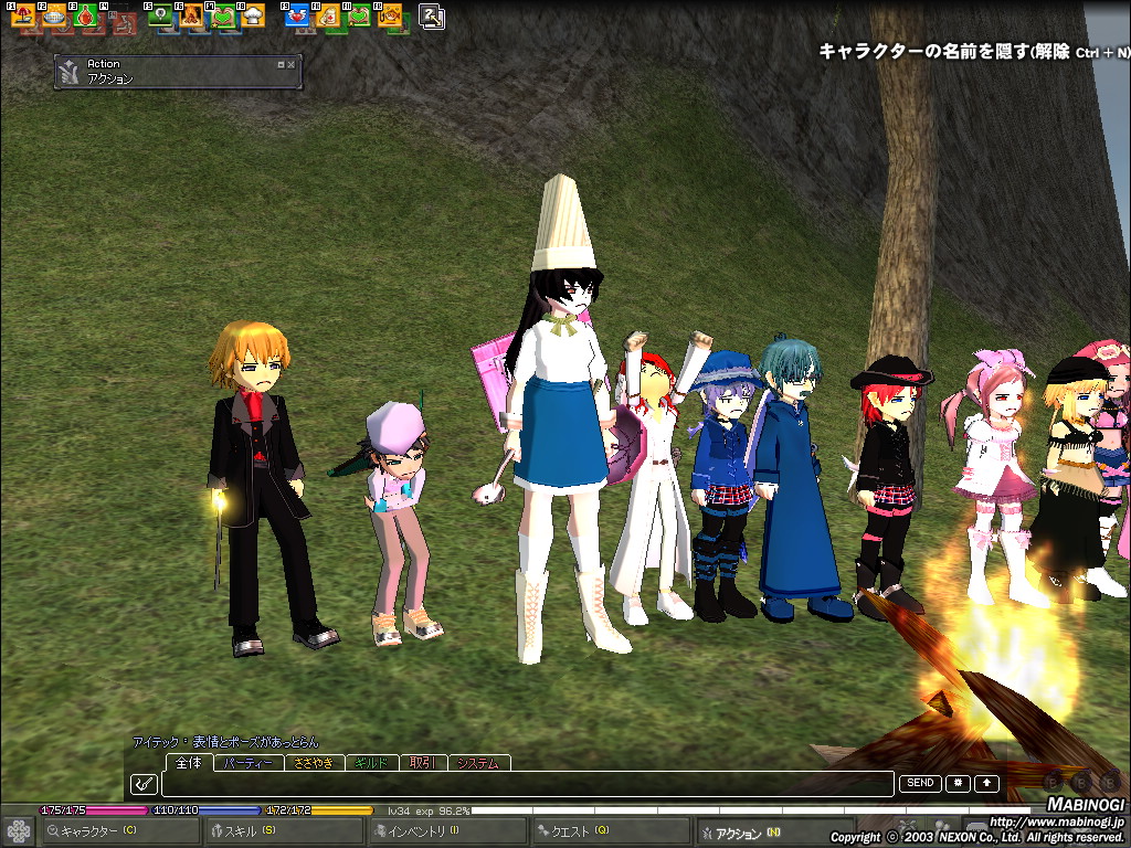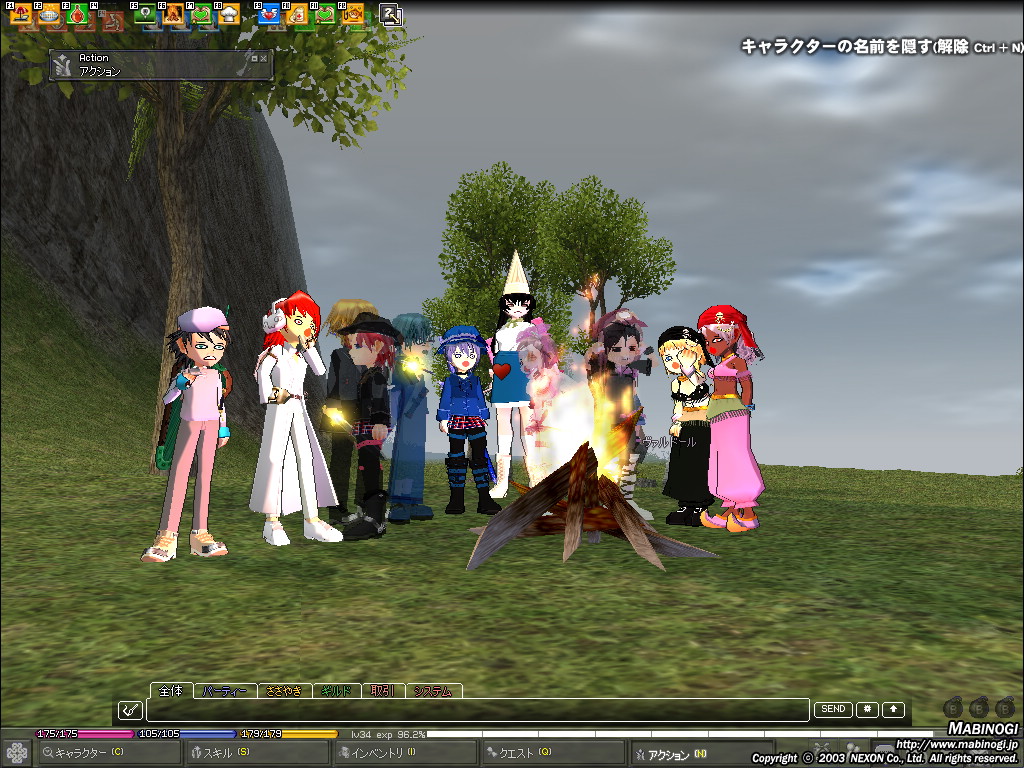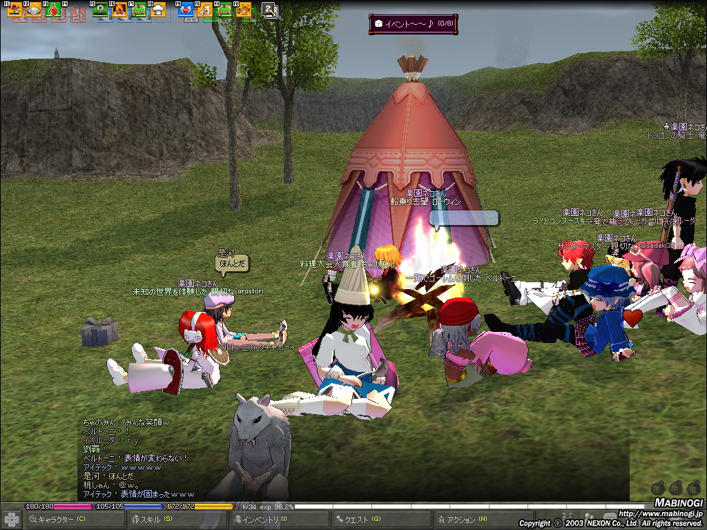 イベント開催しました~。開始前のインベはこんな感じです。料理でいっぱいです。キャンプファイアを囲んでいざ始まり始まり~。まずはムービーの見られる通常料理から。ヒヨコ・・・牛・・・鶏・・・豚・・・・裸族の踊り?・・・ボスモンスター・・・・そしてナオちゃん・・・・全7種。みなさんに堪能していただきました~。みんながムービー見てるときは下のような感じで頭の上に黄色い・・・がw