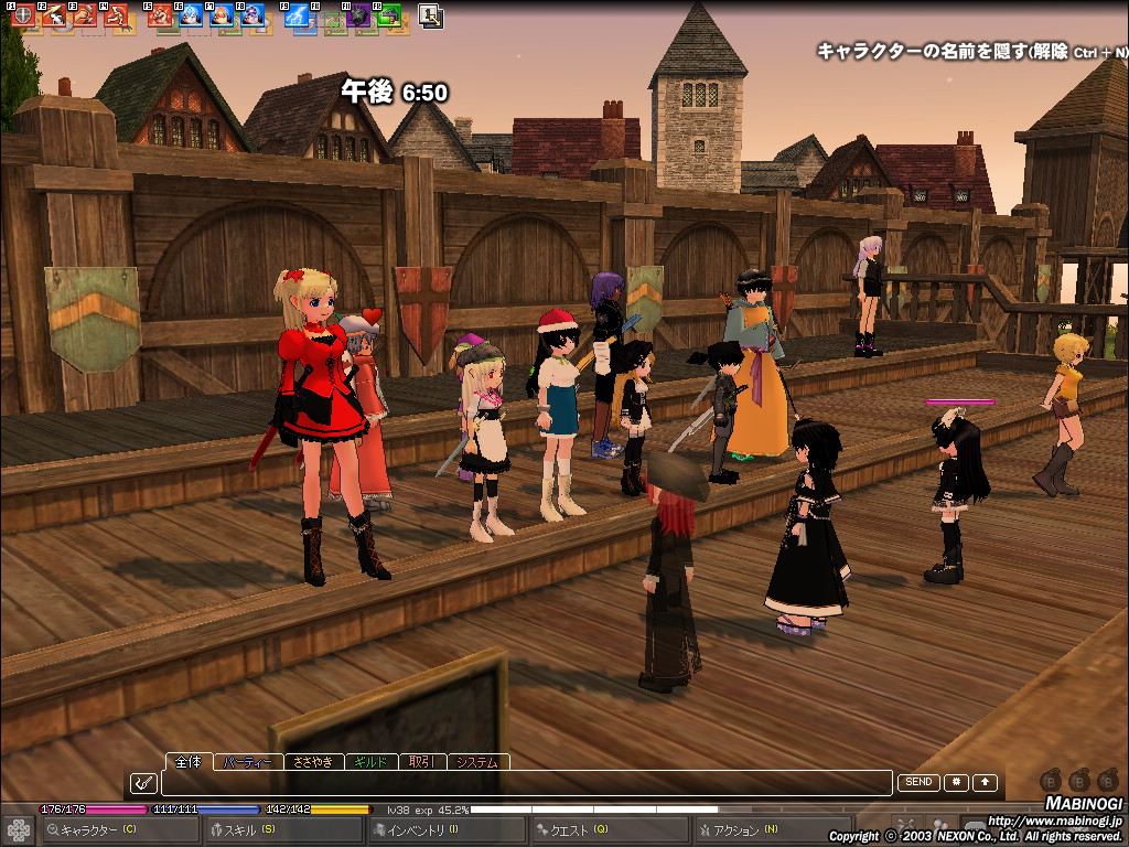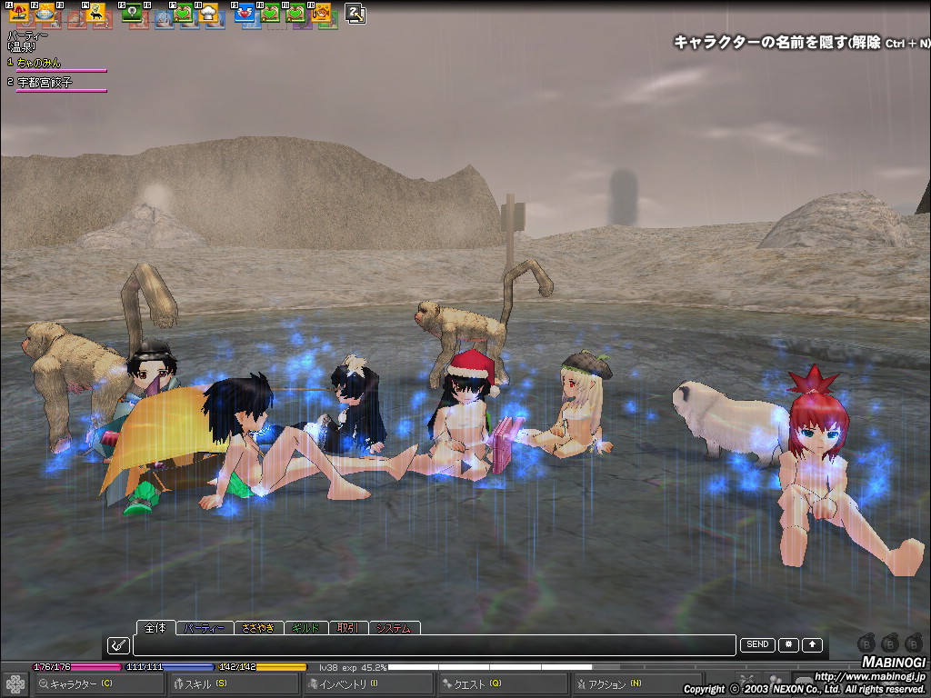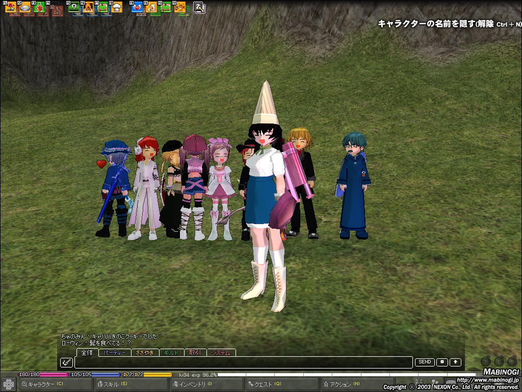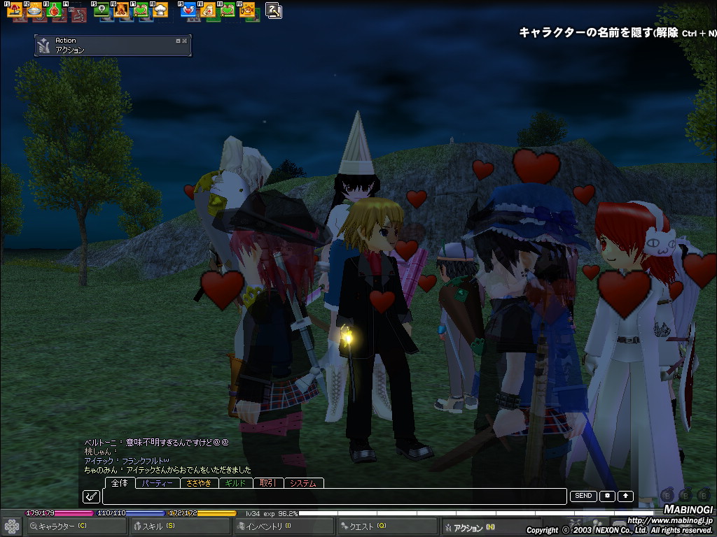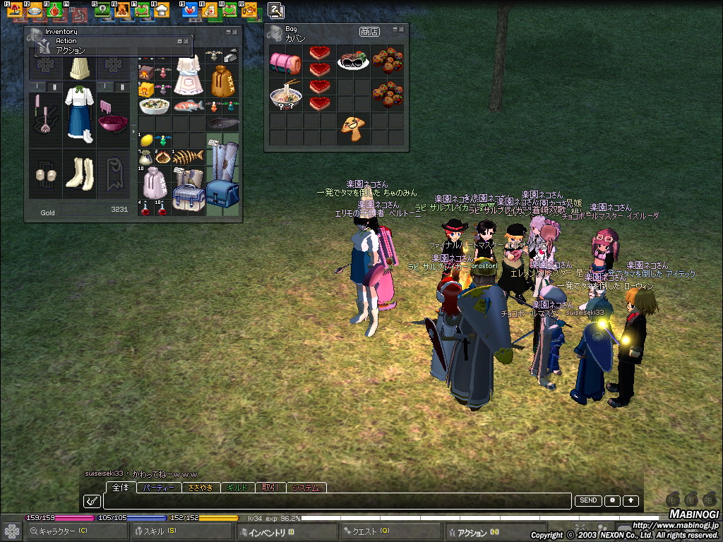 イベント開催しました~。開始前のインベはこんな感じです。料理でいっぱいです。キャンプファイアを囲んでいざ始まり始まり~。まずはムービーの見られる通常料理から。ヒヨコ・・・牛・・・鶏・・・豚・・・・裸族の踊り?・・・ボスモンスター・・・・そしてナオちゃん・・・・全7種。みなさんに堪能していただきました~。みんながムービー見てるときは下のような感じで頭の上に黄色い・・・がw